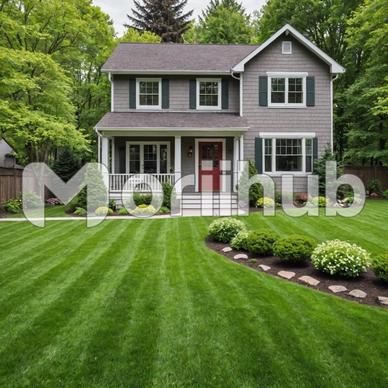 A quaint house sits nestled amidst a neatly trimmed lawn, its white picket fence adding to its charm. The lawn is meticulously cut, the vibrant green grass contrasting beautifully with the natural landscape behind. Behind the house, a lush expanse of greenery unfolds, with tall trees standing like guardians of nature. Their branches sway gently in the breeze, creating a soothing rustle. It’s a scene of tranquil beauty, where the simple pleasures of home and nature come together harmoniously.