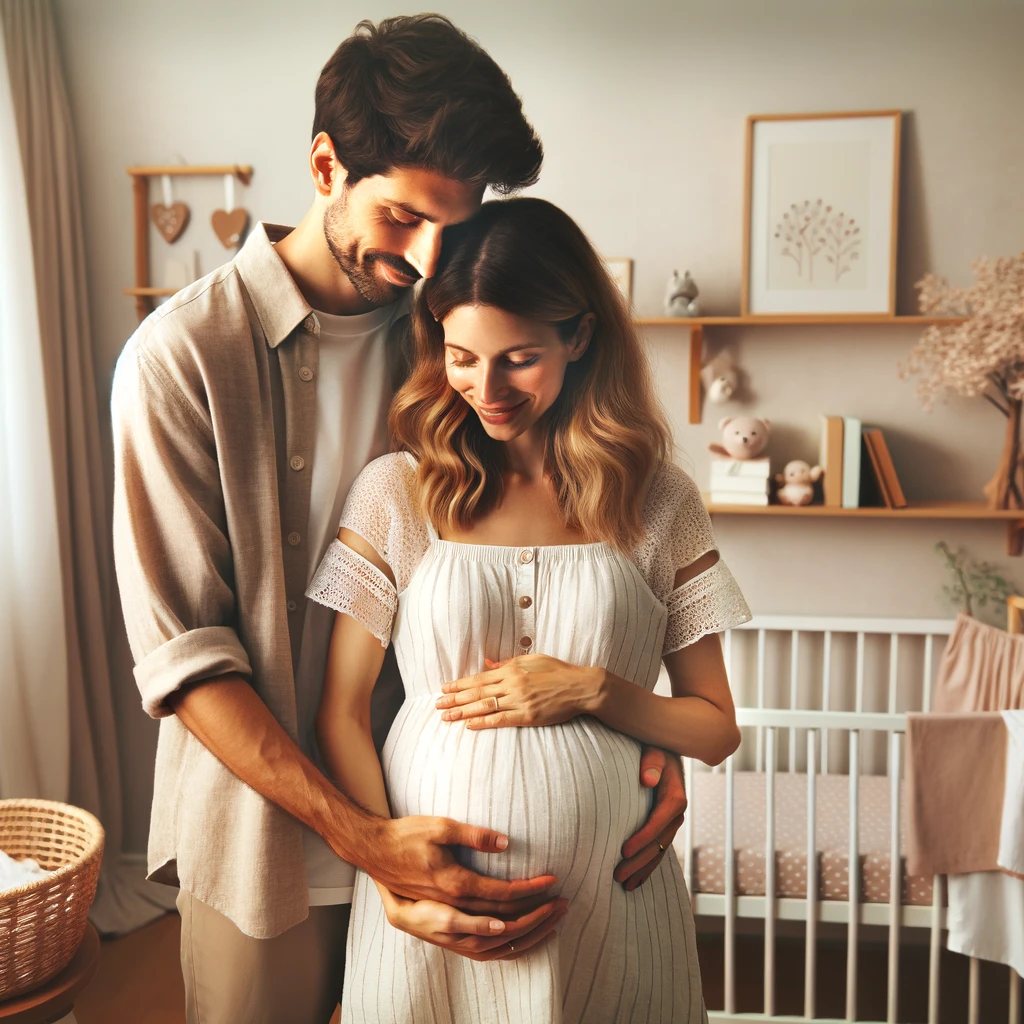 In this tender scene, an expecting couple stands embraced in the nursery, radiating joy and anticipation. The room is a haven of warmth, adorned with soft hues and delicate decor, reflecting their love and anticipation for their soon-to-arrive bundle of joy. Their eyes sparkle with excitement as they envision the precious moments they will share in this lovingly crafted space, filled with dreams and endless possibilities.