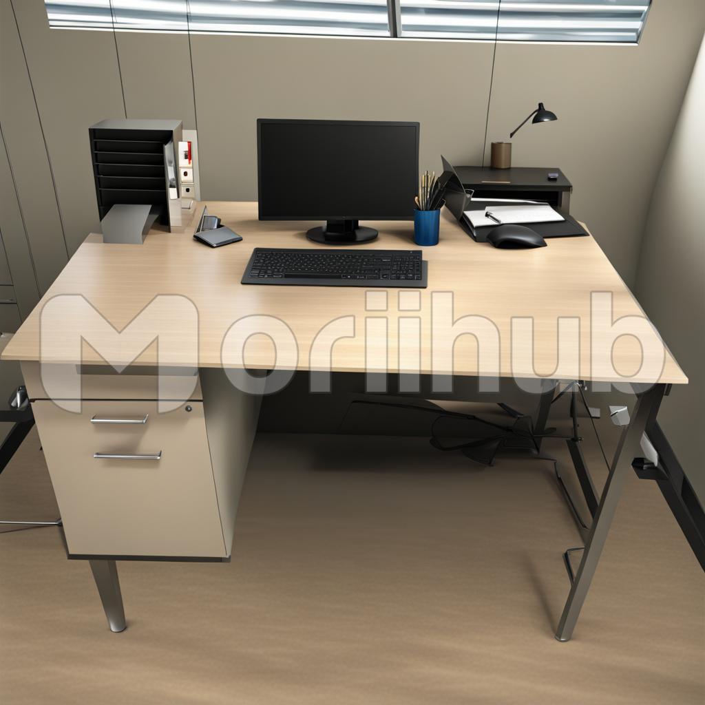 A sleek, mahogany office desk adorned with neatly stacked papers, a minimalist keyboard, and a high-resolution monitor perched atop a swivel stand. The ambient glow of the screen casts a warm light on the organized workspace, creating an inviting and productive atmosphere.