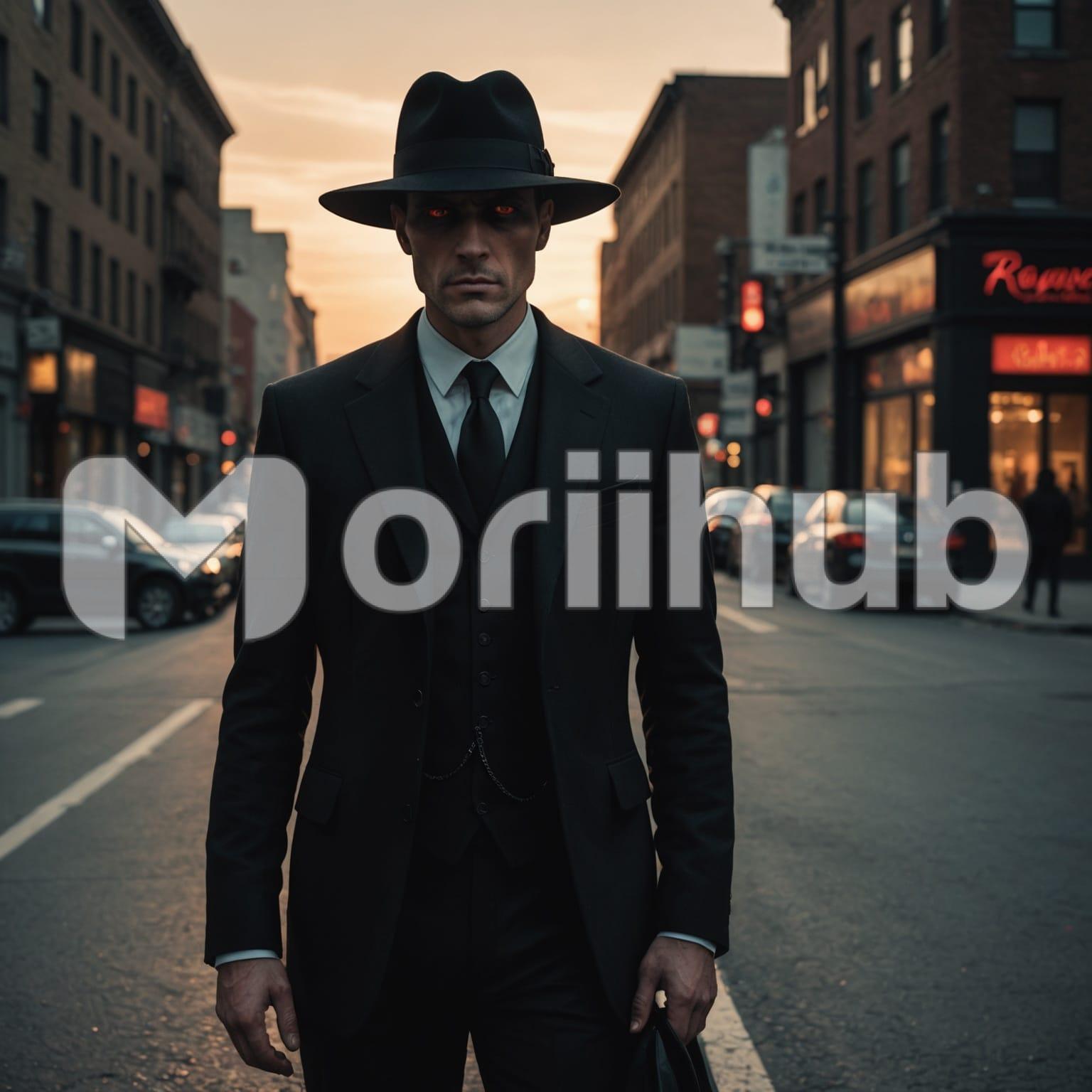 In the quiet solitude of the empty street, an ominous figure strides with purpose, cloaked in a tailored suit and a wide-brimmed hat that obscures much of his face. His eyes emit an unsettling glow, contrasting eerily with the dimly lit surroundings. The row of parked cars stands as silent witnesses to his solitary march. Each step resonates with a sense of foreboding, as if the very shadows are conspiring to conceal his true intent. His presence evokes a chilling aura of mystery and intrigue amidst the deserted urban landscape.