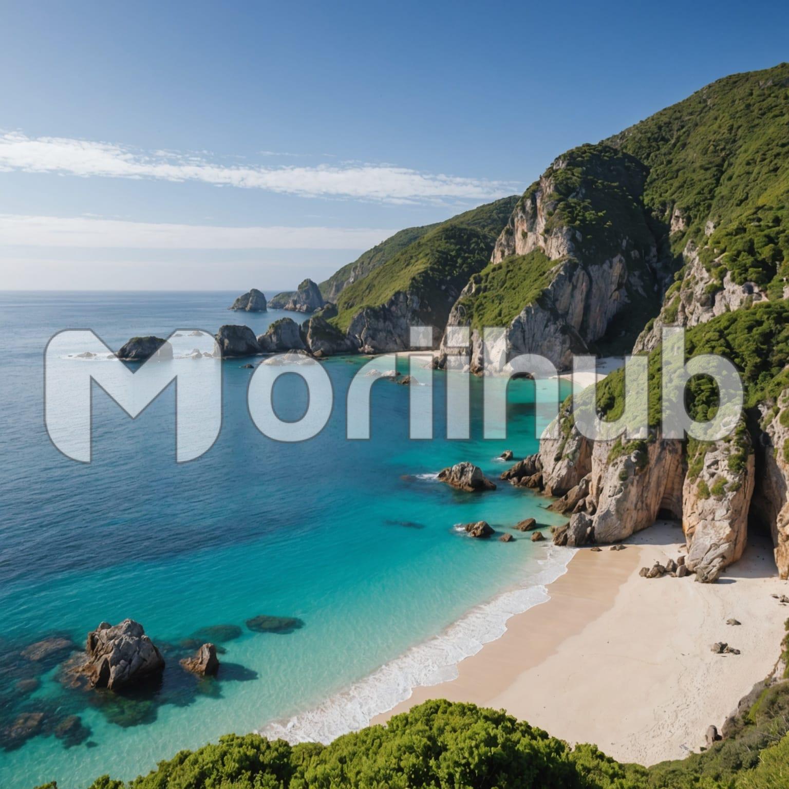 A stretch of green, rocky land unfolds, the uneven terrain dotted with stones and gentle rises that lend a rugged charm to the landscape. In front, the view opens to the calm blue sea, its surface smooth and inviting, stretching endlessly toward the horizon. Sparse clouds drift across the sky, adding subtle texture to the open expanse above. The serene blue of the sea contrasts beautifully with the earthy tones of the rocks and greenery, creating a peaceful, scenic view where land and water meet under a tranquil sky.