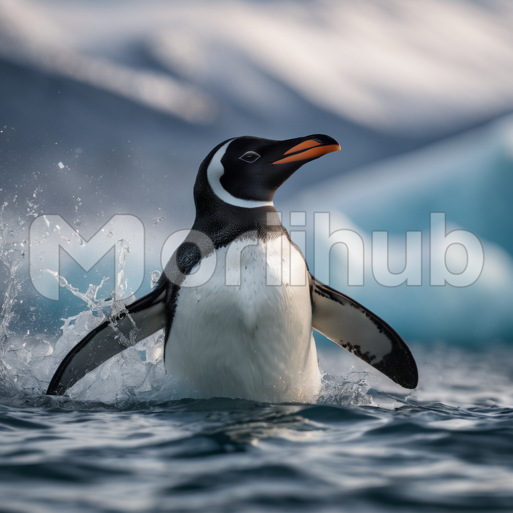 A lone penguin emerges from the depths of the sea, half of its sleek body gracefully visible above the waterline. With a buoyant poise, it epitomizes aquatic elegance, navigating the cool embrace of the ocean. The contrast of its black and white plumage against the blue expanse creates a striking visual symphony, capturing a moment where the avian marvel of nature effortlessly commingles with the serene beauty of its marine habitat.