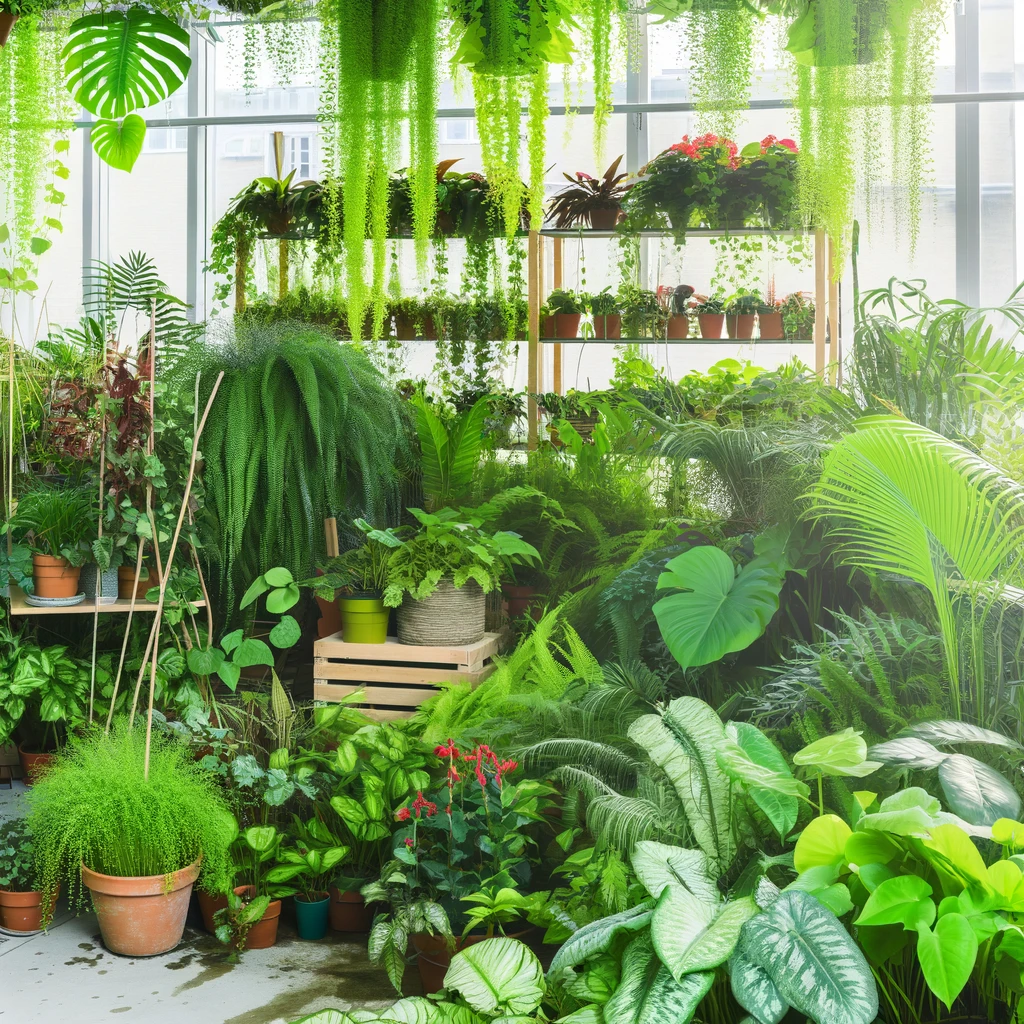 Imagine an image capturing a peaceful and lush indoor garden, teeming with a vibrant variety of plants. Tall, leafy palms stand majestically, their fronds reaching towards the sunlight that filters through the windows. Lush ferns drape gracefully over shelves, while colorful blooms add splashes of natural beauty. The air is alive with the scent of earth and foliage, creating a tranquil oasis of greenery and serenity within the confines of four walls.