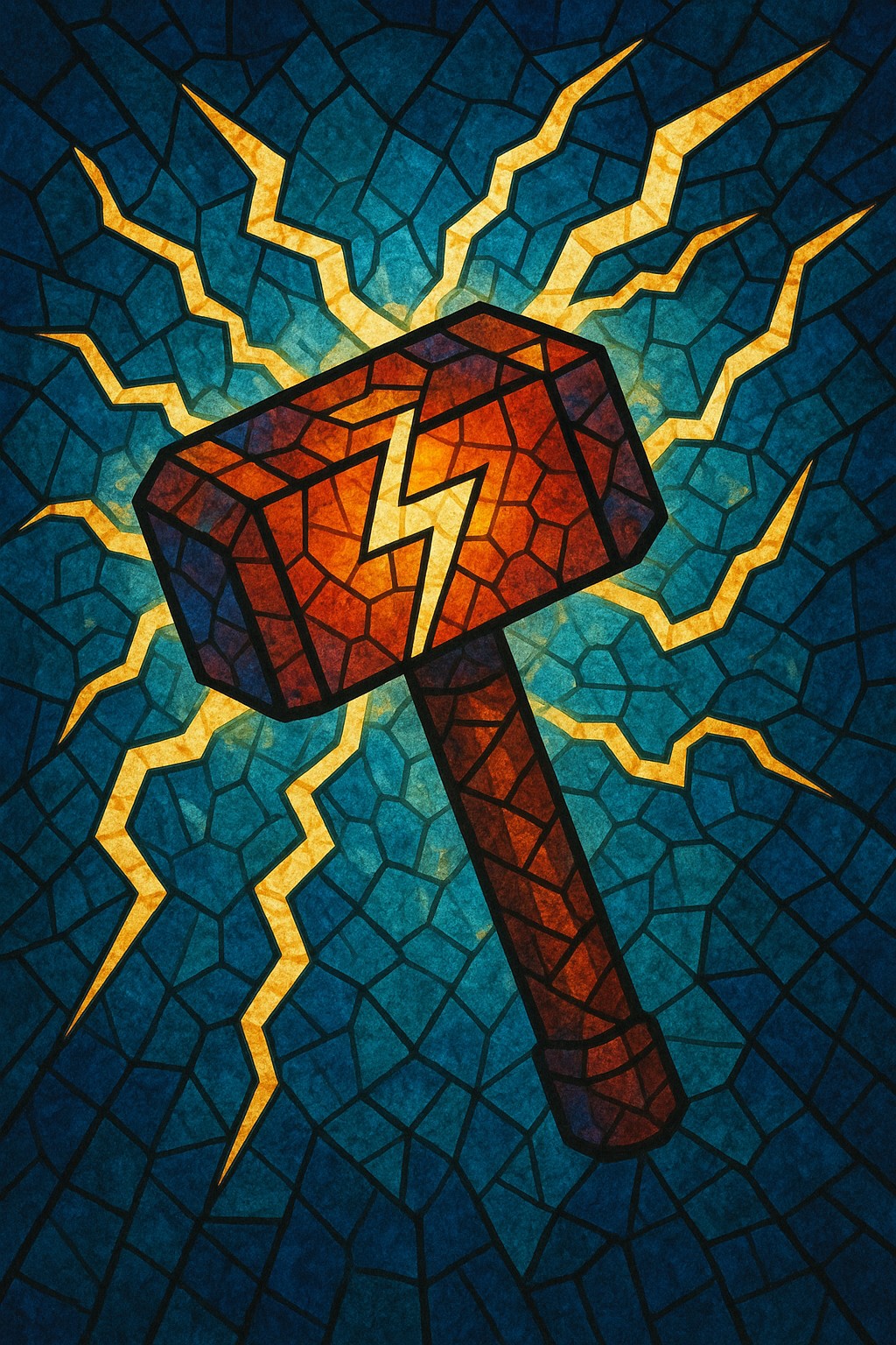 This image is a digital abstract mosaic of a powerful hammer, designed in a stained-glass style. The hammer, composed of warm-toned geometric tiles in red, orange, and yellow, features a lightning bolt motif at its center, symbolizing raw energy or elemental power. Surrounding the hammer is a cool blue background filled with irregular mosaic pieces, accentuating the glowing yellow-white lightning bolts radiating outward.