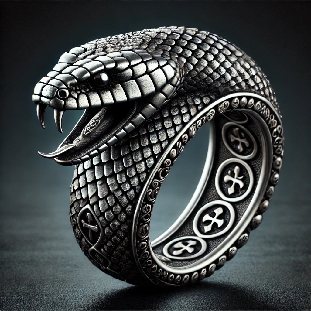 This power snake ring is a bold and captivating piece that represents transformation, stealth, and strength. The ring features a detailed snake coiled around the finger, with piercing, intense eyes and intricately textured scales that capture the snake’s agile and primal nature. The snake’s head is slightly raised with a fierce expression, showcasing sharp fangs that add to its menacing allure. bThe band is embellished with delicate tribal patterns and ancient symbols, emphasizing themes of resilience and adaptability.