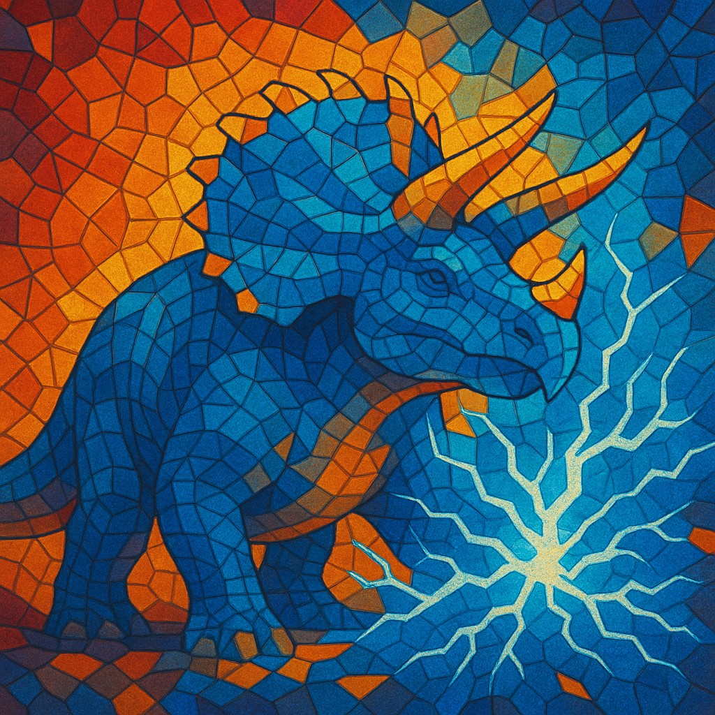 This image is a digital abstract mosaic depicting a Triceratops in a vibrant, stylized design. The dinosaur is composed of tessellated geometric shapes, primarily in shades of blue and orange, giving it a powerful and energetic appearance. The “power element” is represented by dynamic electric tendrils or lightning-like energy emanating from the foreground, enhancing the sense of movement and strength.