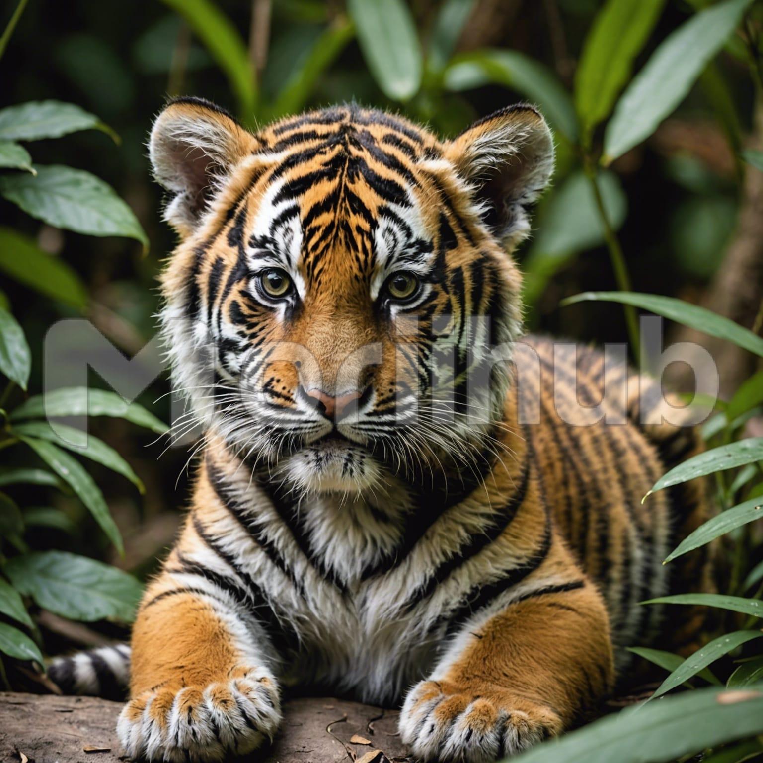 In a dense forest, a close-up captures the majestic tiger lying on the forest floor. Its intense, amber eyes stare ahead with a mix of curiosity and authority, reflecting the deep shadows of the forest. The tiger’s orange and black striped fur, sleek and powerful, contrasts strikingly with the surrounding green foliage and earthy tones. Its whiskers twitch slightly, and the gentle rise and fall of its chest indicate a state of relaxed alertness. This image captures the essence of the wild, a perfect blend of grace and power.