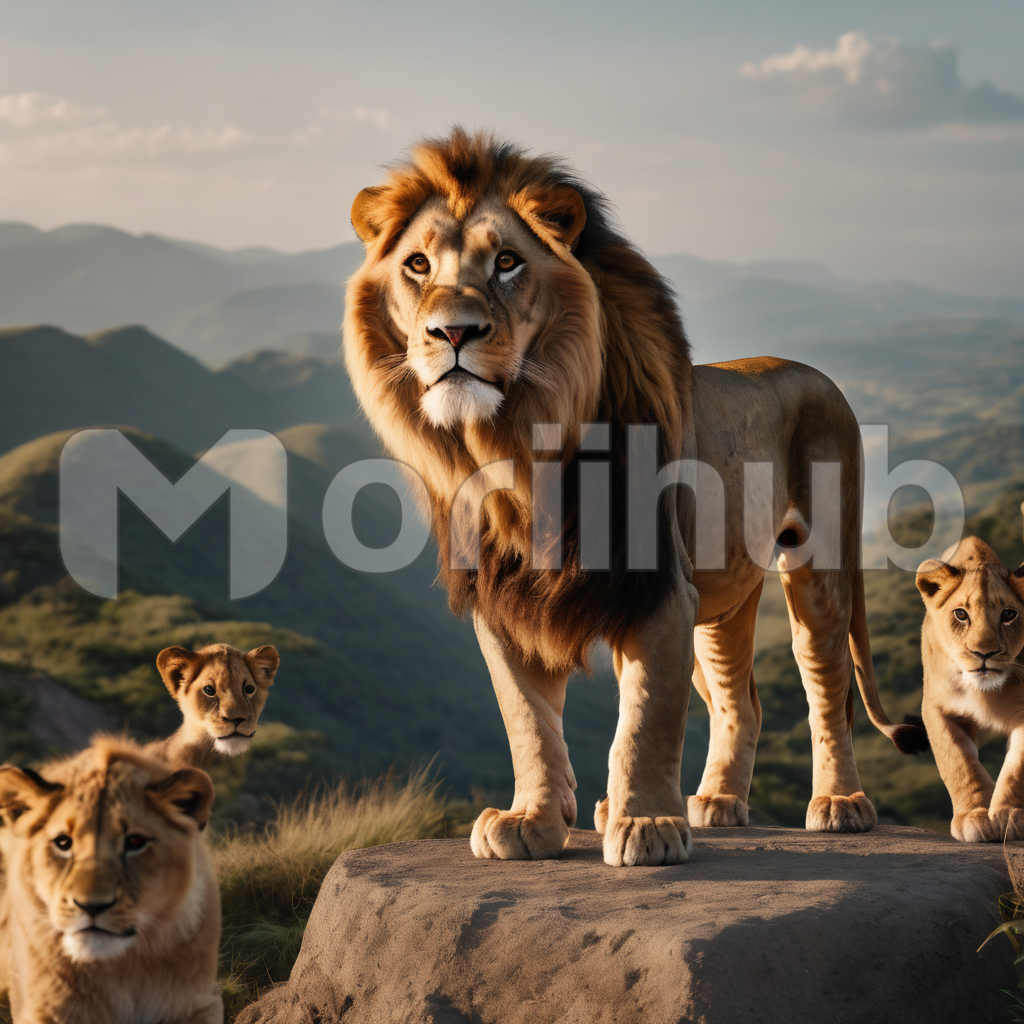 Under a somber, overcast sky, a majestic lion pride assembles on the savannah. Powerful and united, they exude an aura of regal strength. The dominant lion, with a magnificent mane, surveys the horizon, while lionesses and cubs gather close, seeking warmth and protection. In the muted light, their golden coats blend with the earthy landscape, a striking contrast to the dreary heavens above. This lion pride embodies both the wild beauty and resilience of Africa’s untamed plains.