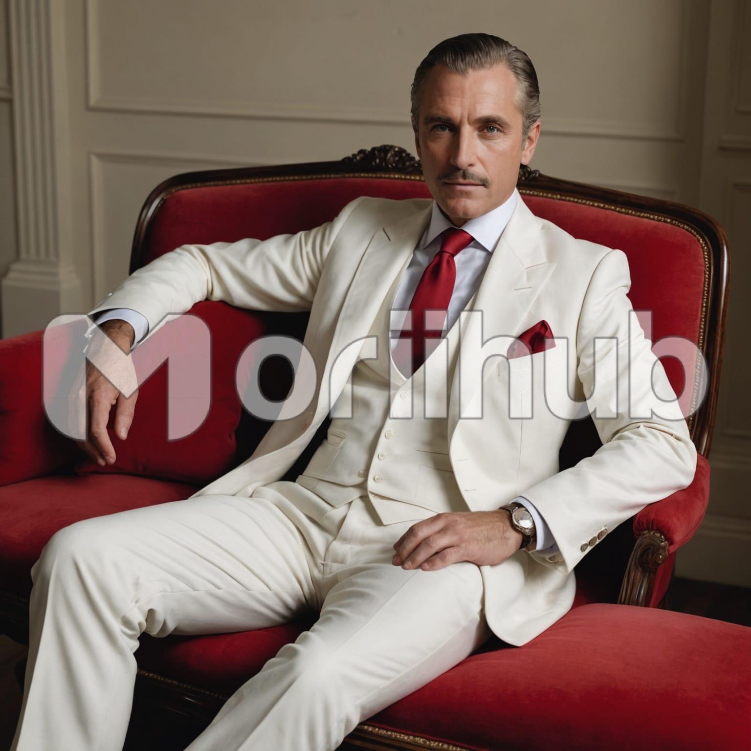 A man sits comfortably in a white three-piece suit, exuding an air of refined elegance. The suit’s crisp lines and tailored fit highlight his well-groomed appearance. The vest adds a touch of classic sophistication, while the suit jacket drapes perfectly over his shoulders. He wears a subtle, confident expression, his posture relaxed yet composed. The pristine white of the suit contrasts with the setting around him, making him a striking figure. His overall demeanor reflects both confidence and grace, enhancing the suit’s timeless charm.