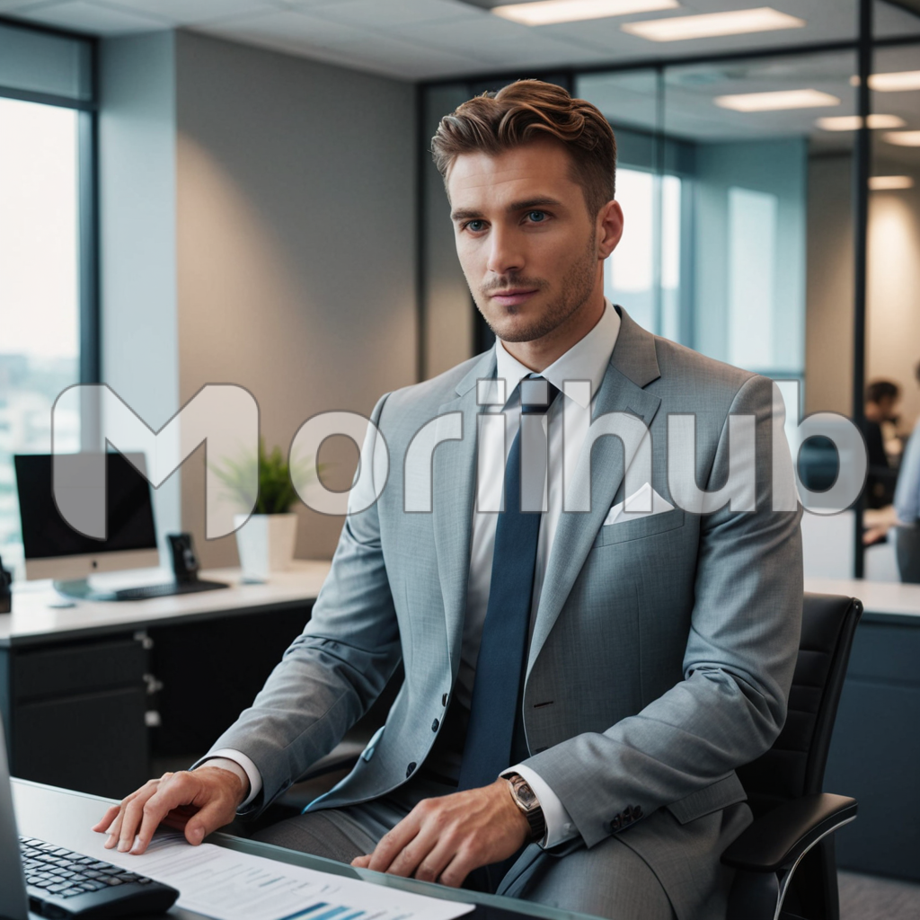 In the hallowed halls of the office, a man sits poised, clad in the armor of professionalism—a tailored suit. Each fabric fiber whispers tales of dedication and ambition. Confidence radiates from his every gesture as he navigates his workspace, his posture exuding determination. In the sanctuary of his chair, he becomes the embodiment of focus, his suit a shield against distraction, his demeanor a testament to his commitment to excel in the corporate arena.
