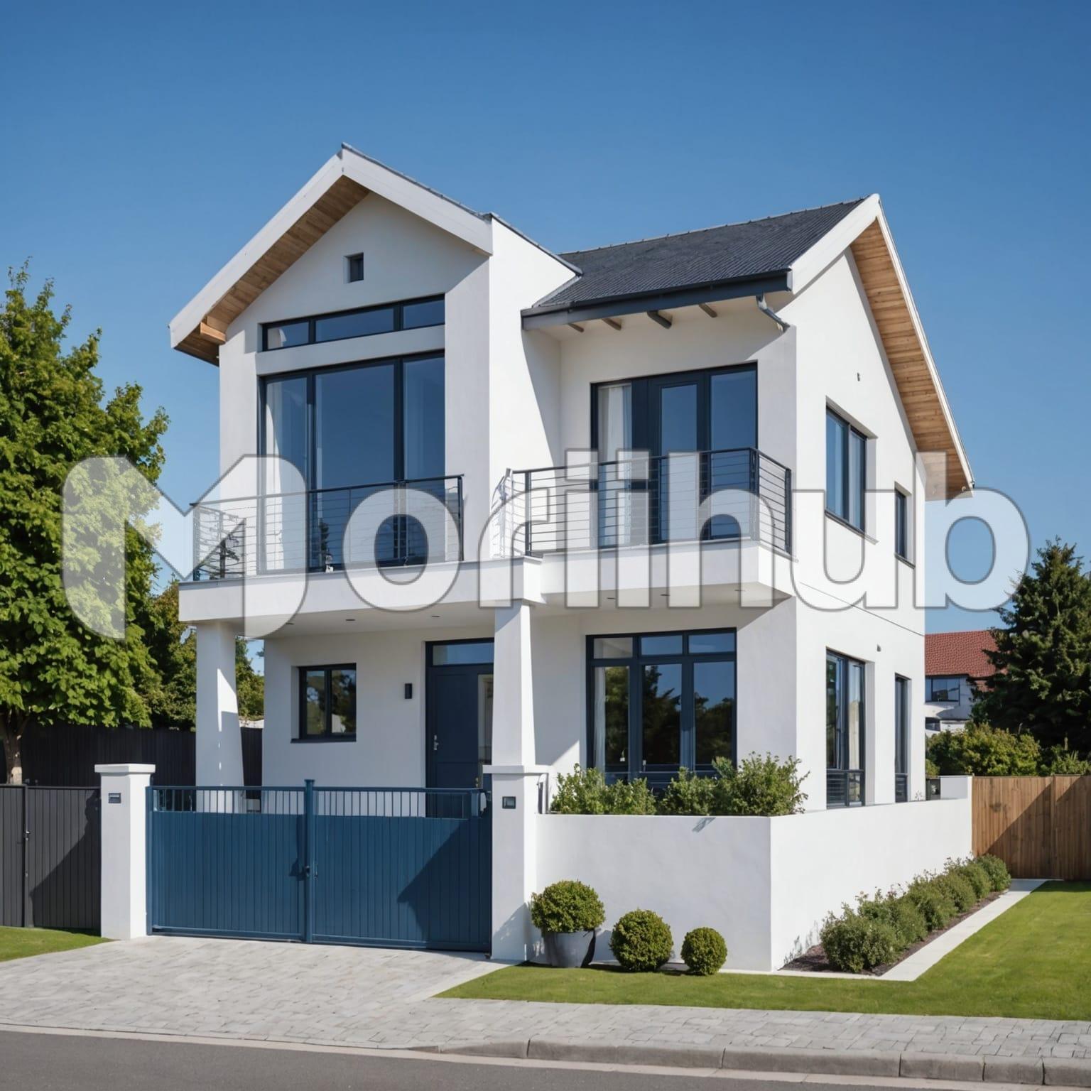 A house stands proudly, its walls painted white, exuding a sense of charm and simplicity. At the corners of the property, trees provide a touch of natural beauty, framing the scene with their gentle presence. A white-painted fence runs along the perimeter, neatly enclosing the yard, with a gate situated at the front, inviting visitors inside. The house’s clean, bright appearance contrasts against the backdrop of a clear sky, giving the entire setting a serene and welcoming feel. The overall composition feels peaceful and well-kept, blending structure with nature.