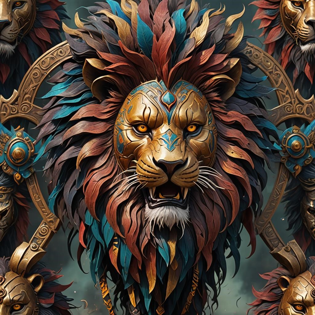 A magnificent and regal lion, depicted with an artistic blend of natural and ornamental elements that give it a divine and majestic appearance. The lion’s face is fierce and commanding, with a mouth slightly open to reveal sharp teeth, and eyes that gleam with a golden intensity. The gaze is penetrating, exuding power and authority.