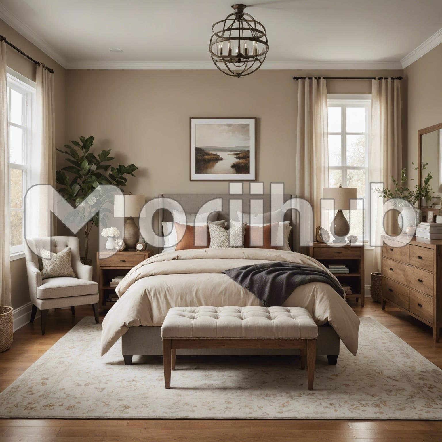 A serene bedroom exudes comfort and style. A plush bed, the focal point, is flanked by sleek lamps on either side, casting a warm, inviting glow. Above the bed, a piece of art adds a touch of sophistication and personal flair. In one corner, a cozy couch offers a perfect spot for relaxation or reading. Opposite, a potted plant brings a breath of fresh air and a hint of nature into the space. The room, thoughtfully arranged and tastefully decorated, creates a peaceful retreat for rest and rejuvenation.
