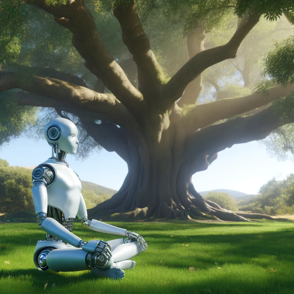 In the dappled shade of an ancient oak, a humanoid robot sits, its sleek form a testament to modern design. With graceful lines and serene posture, it exudes tranquility. Its metallic surface catches the gentle sunlight filtering through the leaves, creating an ethereal aura in this peaceful sanctuary.