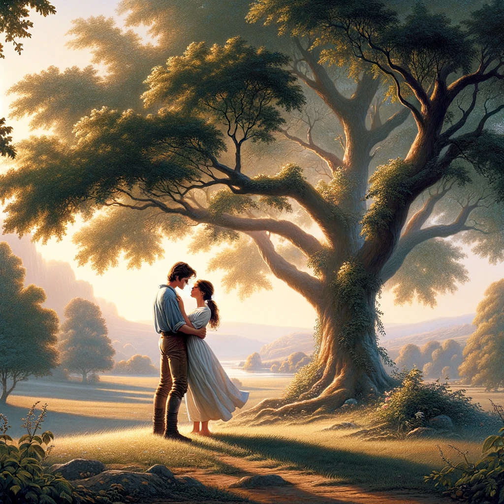 In the embrace of an idyllic setting, two lovers reunite beneath the sprawling canopy of a lush tree. Soft sunlight filters through the verdant leaves, casting a gentle glow upon their entwined figures. In this tranquil haven, time stands still as they bask in the warmth of their affection, lost in each other’s gaze.