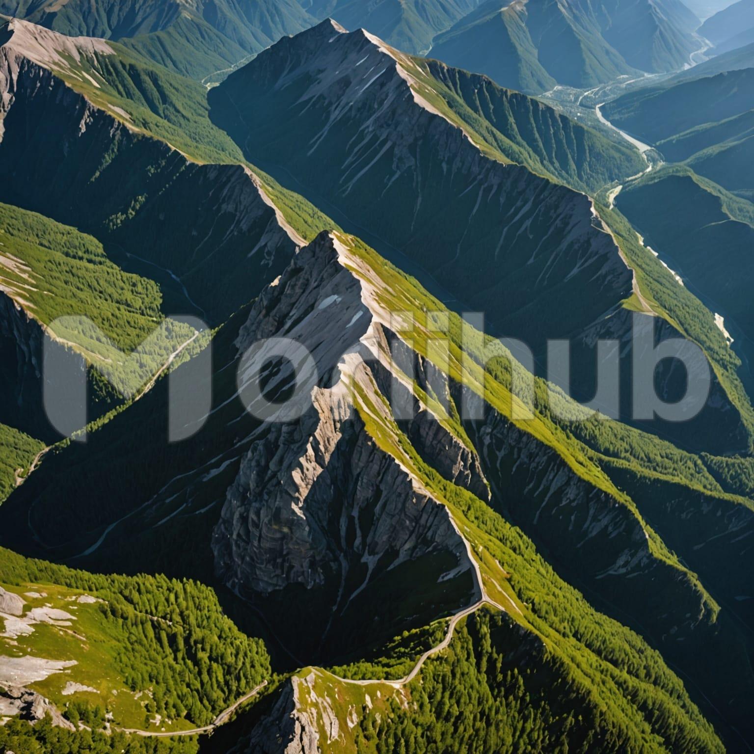From above, the mountain range stretches majestically across the landscape, its peaks and ridges cutting sharply into the horizon. The rugged terrain is clothed in hues of green and brown, interspersed with patches of rocky outcrops. The air is crisp and clear, offering a bird’s-eye perspective that captures the grandeur and tranquility of the untouched wilderness sprawling beneath the expansive sky.