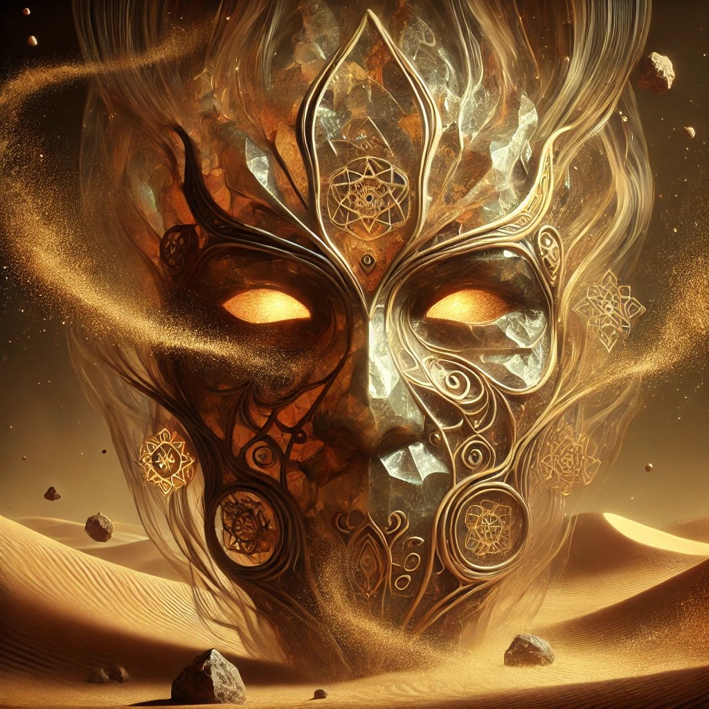 A mystical mask sculpted entirely from translucent crystal, infused with the power of the sand element. The crystal shimmers in shades of golden amber and soft brown, radiating an ancient desert energy. The mask’s surface is engraved with swirling sand patterns and mystical runes. Streams of sand swirl around the mask, forming ethereal dunes and flowing patterns in the air. The eyes of the mask glow with golden light, symbolizing control over sand and earth.