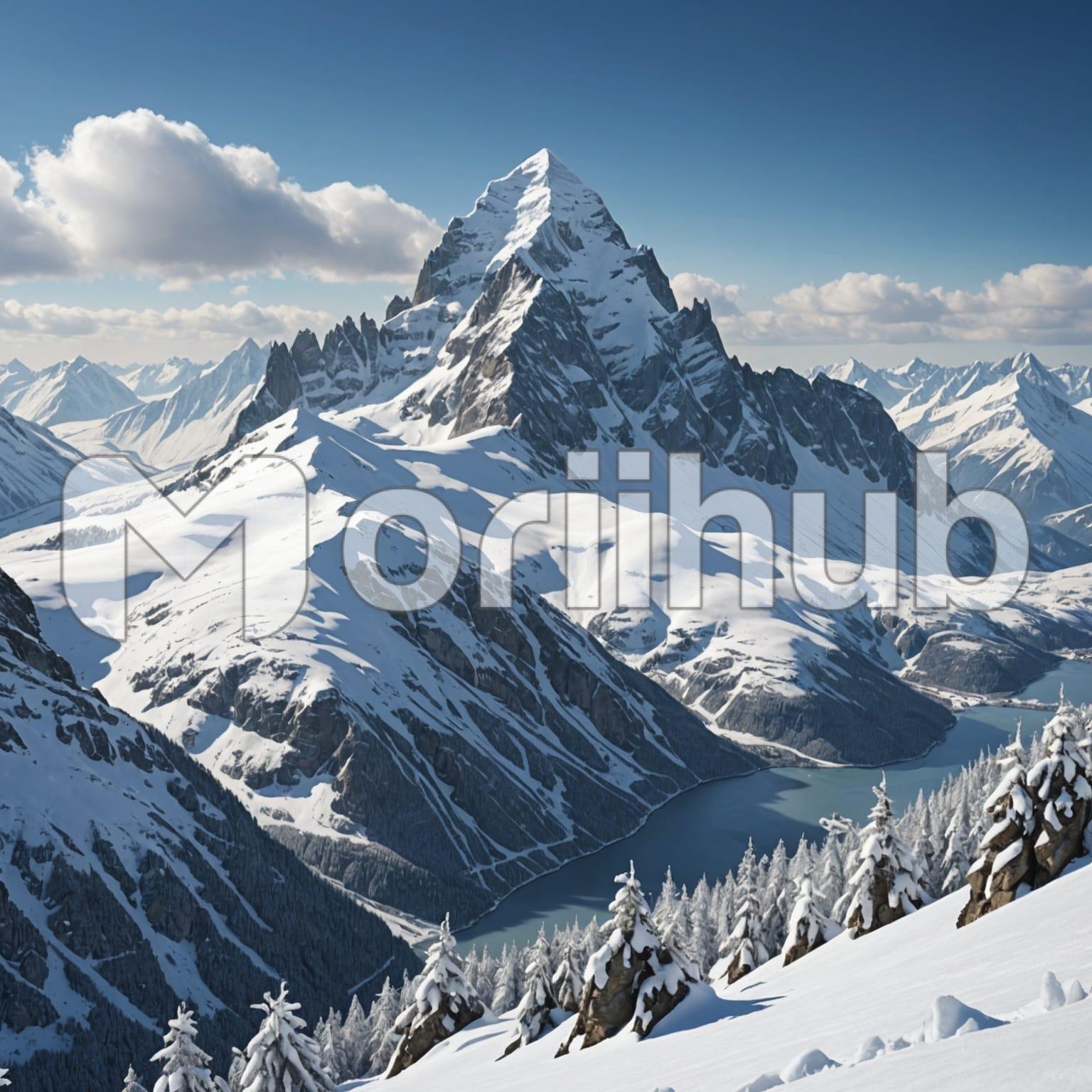 Snowy mountains rise majestically ahead, their peaks dusted in fresh, powdery snow, creating a striking, tranquil backdrop. In front, a line of trees stands resiliently, their branches dusted with snow, adding texture and depth to the scene. Wisps of clouds drift gracefully across the sky, enhancing the mountains’ towering presence and creating a sense of movement in the serene landscape. The scene is quiet and inviting, capturing the beauty of nature in winter, with layers of mountains, trees, and clouds blending seamlessly in the peaceful expanse.