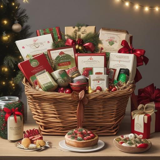 A Christmas hamper, a delightful festive treasure trove, brims with seasonal indulgences. Overflowing with gourmet delights like rich chocolates, artisanal cookies, premium wines, aromatic coffees, and savory spreads, it embodies the spirit of giving. Adorned with festive ribbons and nestled in a wicker basket, it radiates warmth, making it the perfect gift to share joy and create lasting holiday memories.