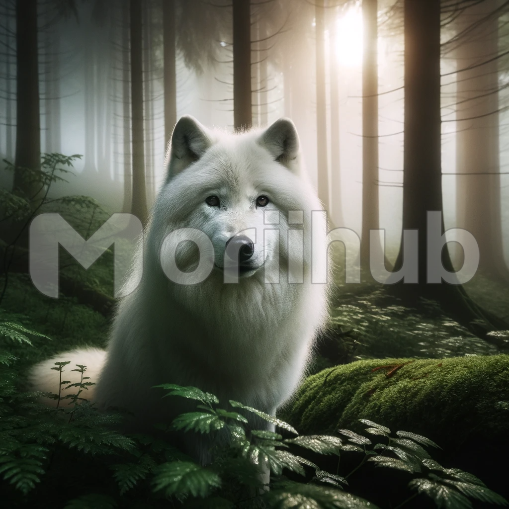 In the heart of a dense forest, a magnificent white wolf stands regally, its piercing, crystal-blue eyes fixed on a distant horizon. Its snow-white coat blends seamlessly with the winter landscape, embodying an ethereal presence amidst the ancient trees. The wolf’s stoic demeanor and unwavering gaze evoke a sense of wisdom and wild beauty, a living legend within the tranquil and mysterious woodland realm.