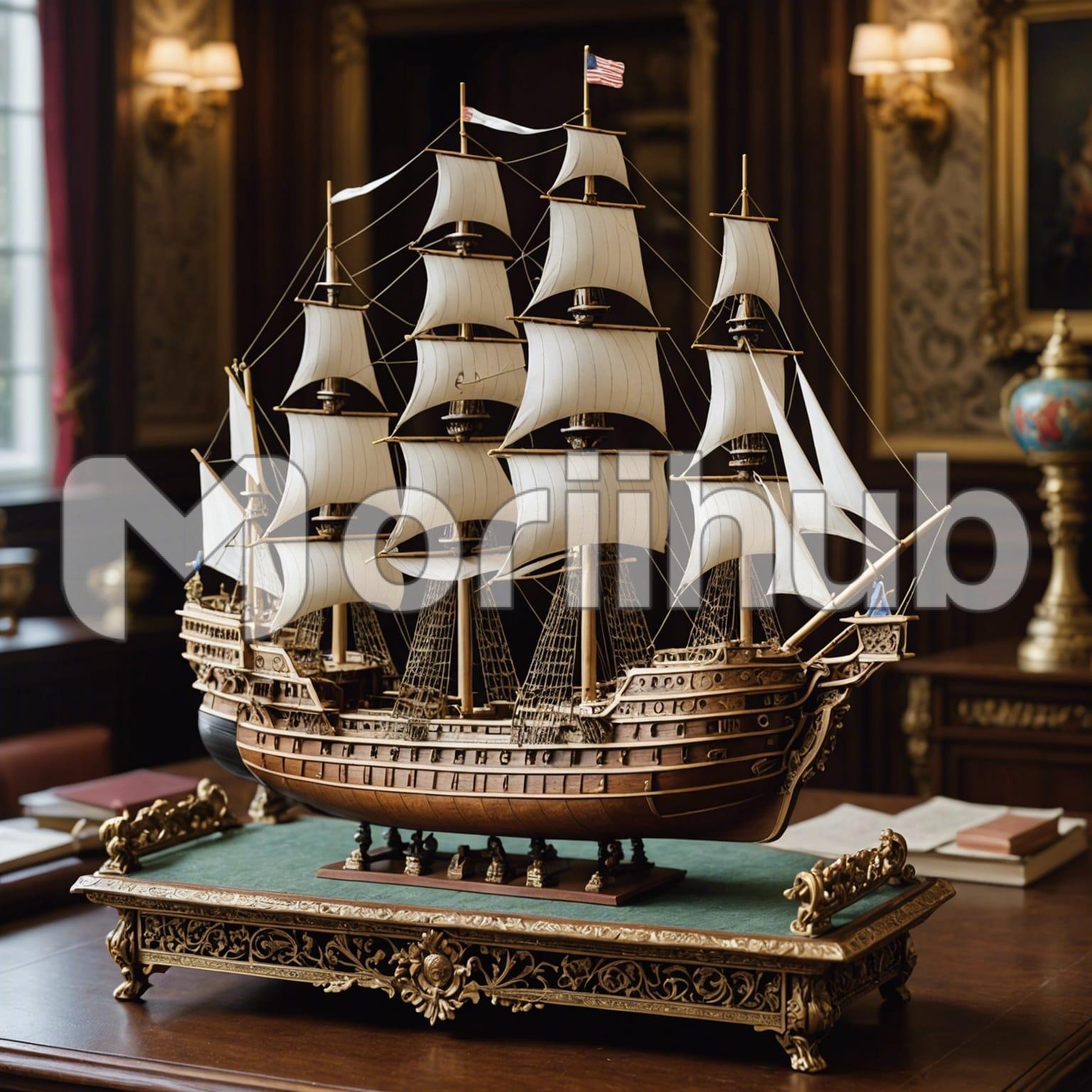 Upon a sturdy table rests a meticulously crafted scale model of a ship, its sails billowing proudly as if caught in a gentle breeze. Each detail is painstakingly rendered, from the intricate rigging to the miniature figurehead adorning the prow. The wood of the hull gleams with a polished sheen, hinting at the craftsmanship that went into its creation. As if frozen in time, the ship stands ready for adventure, a tribute to the seafaring spirit and the timeless allure of the open sea.