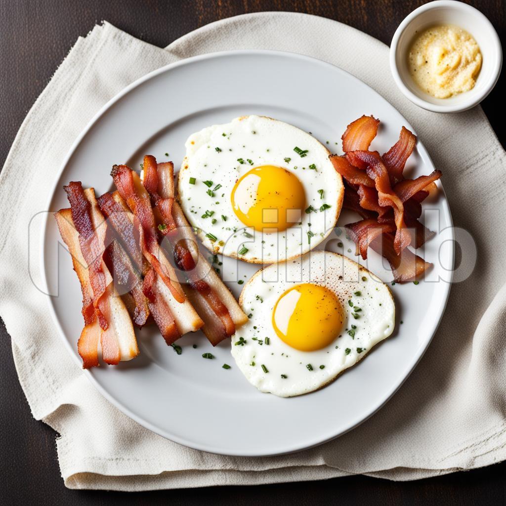 A classic breakfast tableau unfolds with sizzling bacon strips alongside perfectly fried eggs, nestling on a pristine plate. The bacon’s savory aroma intertwines with the golden allure of sunny-side-up eggs. Each bacon slice boasts a crispy texture, while the eggs’ yolks await release, promising a delectable symphony of flavors. The plate embodies the timeless allure of a hearty morning meal, inviting indulgence in the savory bliss of bacon and the sun-kissed richness of eggs.
