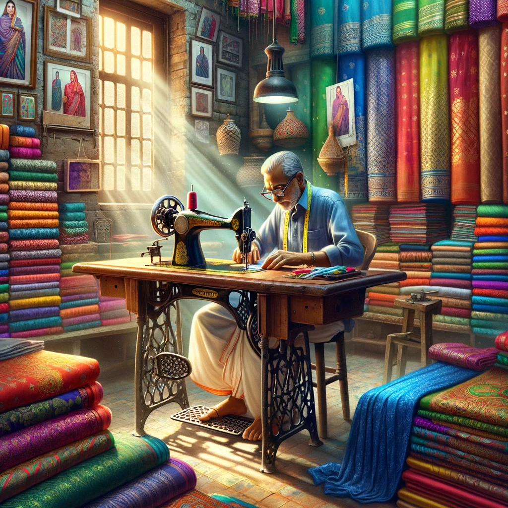 In a bustling Indian tailor shop, a skilled craftsman meticulously works amidst a kaleidoscope of vibrant colors and textures. Surrounded by traditional Indian fabrics, he brings to life intricate designs and patterns with nimble fingers. The rich tapestry of hues and textiles encapsulates India’s cultural diversity, weaving together the essence of craftsmanship and artistic expression in a captivating display of tradition and creativity.