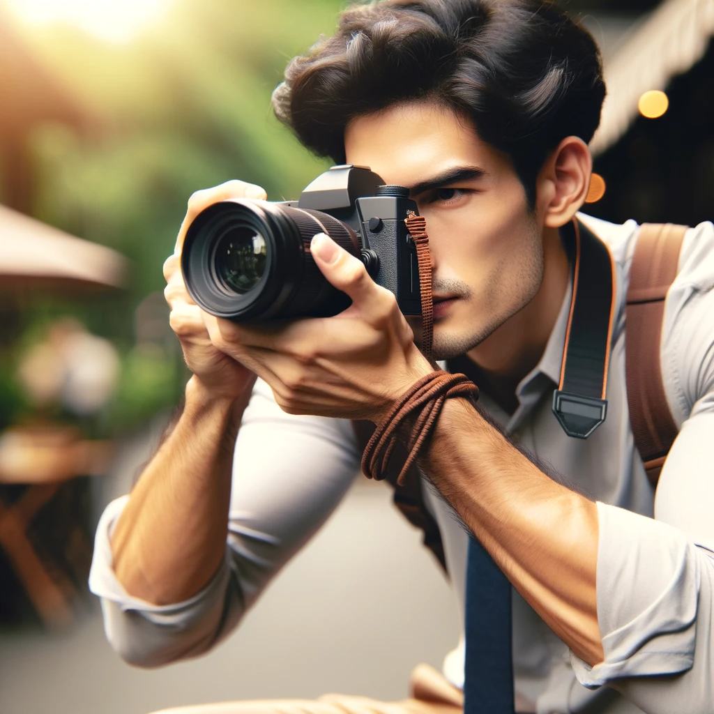 Picture a skilled professional photographer immersed in their craft, elegantly dressed in smart casual attire. With an air of precision, they wield their camera like an extension of themselves, expertly framing a scene. Their keen eye locks onto a fleeting moment, ready to seize it forever through the lens, showcasing the seamless blend of artistry and technical mastery.