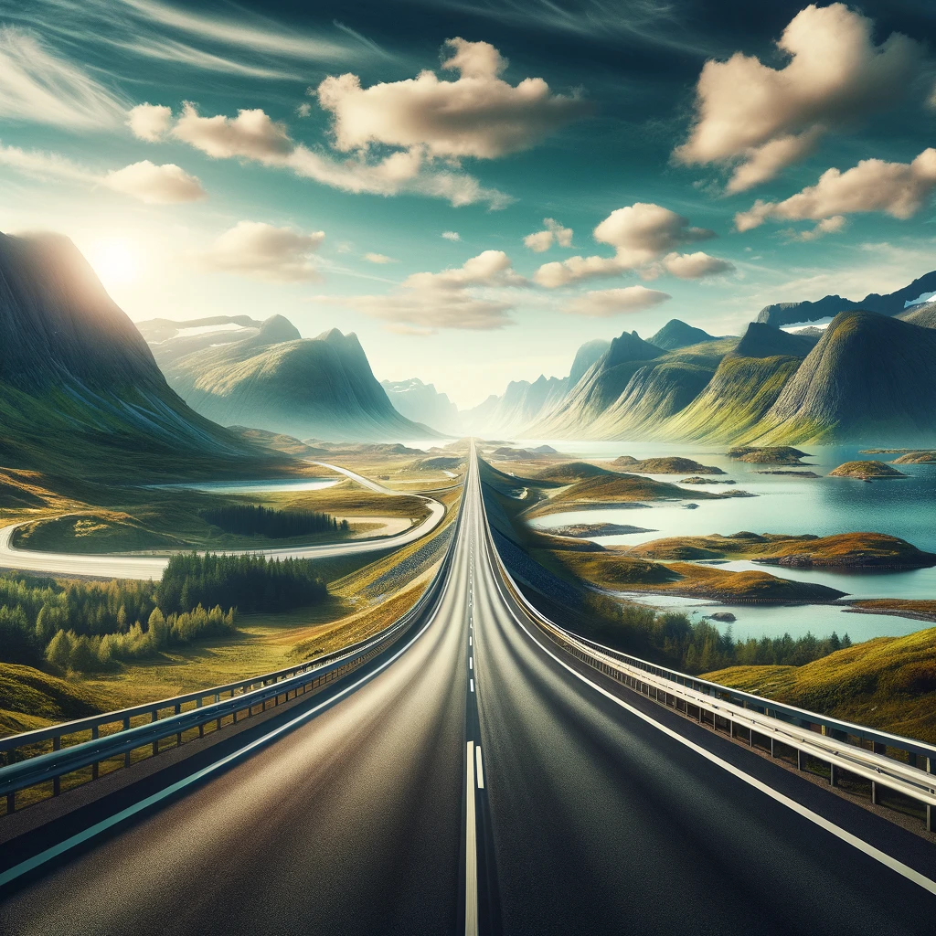 In this serene highway scene, a smooth, well-maintained road stretches far into the distance, cutting through a breathtaking landscape. Lush greenery and towering mountains frame the highway, creating a picturesque tableau. The road disappears into the horizon, inviting travelers to embark on a journey of endless possibilities and awe-inspiring vistas.