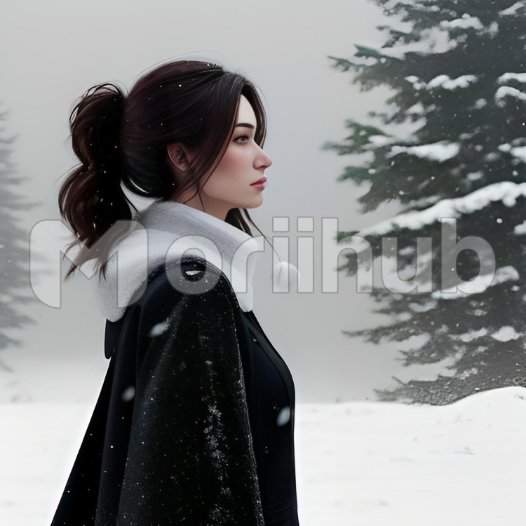 In a winter wonderland, a beautiful woman walks gracefully through the pristine snow. Each step leaves an ephemeral imprint, a delicate dance between nature and elegance. The world around her is draped in a serene blanket of white, contrasting with her radiant presence. She is a vision of tranquility, leaving whispers of beauty in her wake.
