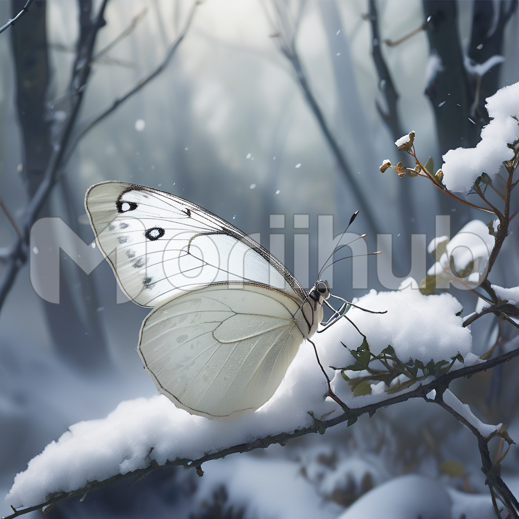 A delicate white butterfly alights upon a snow-covered branch, its fragile wings contrasting against the pristine white backdrop. The powdery snow envelops the branch, creating a serene winter scene. The butterfly’s ethereal presence adds a touch of grace to the cold landscape, its intricate patterns a testament to nature’s beauty. Against the wintry backdrop, it stands as a symbol of resilience and beauty, a fleeting moment of tranquility in the midst of winter’s chill.