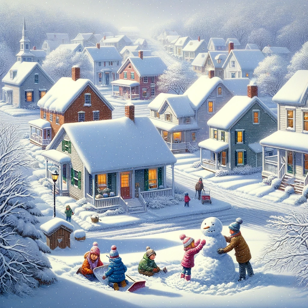 In the small town, a serene tranquility descended with the snowfall, enveloping every street and building in a pristine white blanket. Trees bowed under the weight of glistening snowflakes, while rooftops wore crowns of icicles. Laughter echoed as children built snowmen, their joyful spirits dancing in harmony with the hushed beauty of the winter landscape.