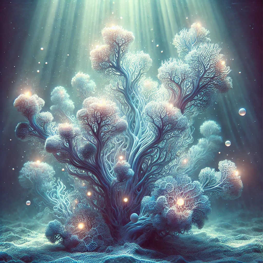 Soul coral growing in a serene, otherworldly part of the ocean, where the boundaries between the physical and spiritual realms blur. The coral is delicate and ethereal, with branches that seem almost translucent, glowing with a soft, inner light that pulses gently, like the rhythm of a heartbeat. The colors of the coral are a blend of soft blues, gentle purples, and silvery whites, giving it a ghostly, spiritual appearance.
