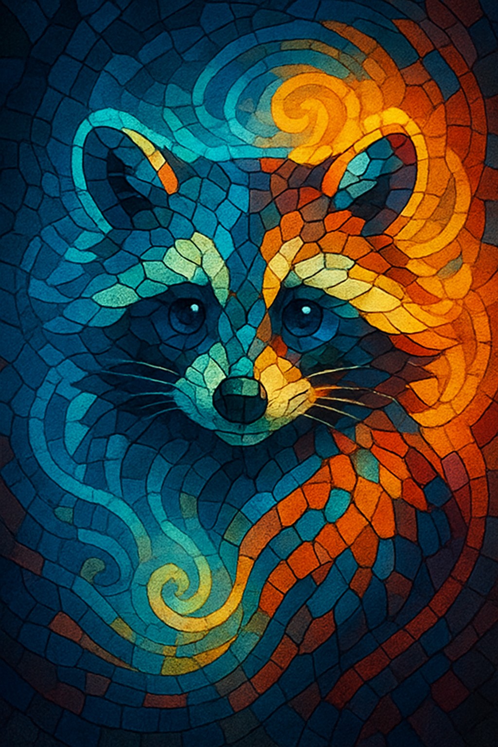This image is a digital abstract mosaic portraying the face of a raccoon, artfully constructed with a pattern of colorful, irregular polygonal shapes reminiscent of stained glass. The composition is rich in vibrant blues, fiery oranges, and golden yellows, creating a striking contrast that symbolizes the element of soul—depicted as swirling, glowing patterns radiating from and surrounding the raccoon.