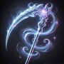 A mystical, glowing crystal scythe with ethereal, soul-like energies swirling around the blade. The scythe should be transparent, with spectral, ghostly lights emanating from it. The soul energy inside the crystal glows faintly in purple and blue hues, giving the weapon an otherworldly, powerful look. The scythe’s blade should have a sharp, curved design, almost as if it’s alive with the power of souls trapped inside.