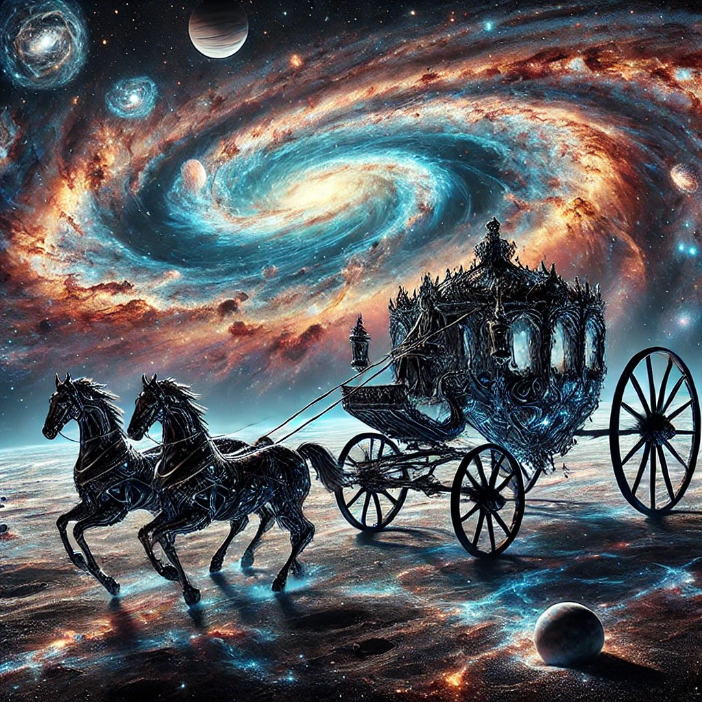 Carriage embodies the vastness and mystery of the cosmos. The body of the carriage is crafted from a material that resembles the deep void of space, with swirling patterns of distant galaxies, nebulae, and star clusters embedded within it. The wheels are formed from rotating cosmic rings or spinning black holes, creating a sense of endless motion.