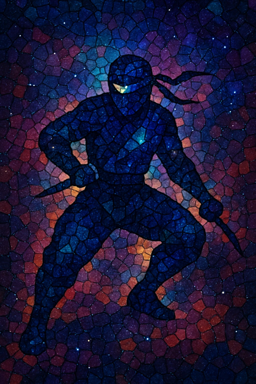 The image shows a digital abstract mosaic of a ninja formed from irregular polygonal tiles, giving it a stained-glass effect. The ninja is posed in a crouched, dynamic stance, holding a dagger in each hand. The figure is composed of deep space-themed colors—mainly blues, purples, and blacks—interspersed with cosmic textures like star clusters and nebulae.