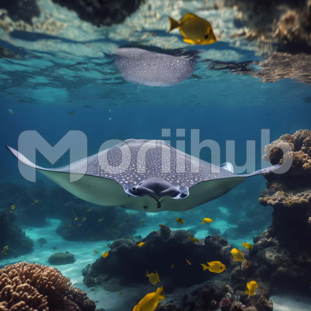 In the profound depths, a stingray gracefully glides, its wings rippling like a shadowy dancer in the aquatic ballet. Shoals of vibrant fish weave around, creating a mesmerizing spectacle of underwater life. The stingray’s sleek form and the kaleidoscope of fish hues blend into a serene aquatic tapestry. In this hidden world, nature’s elegance unfolds, capturing the elusive beauty of marine life as the stingray becomes a majestic presence amidst the balletic movements of its aquatic companions.