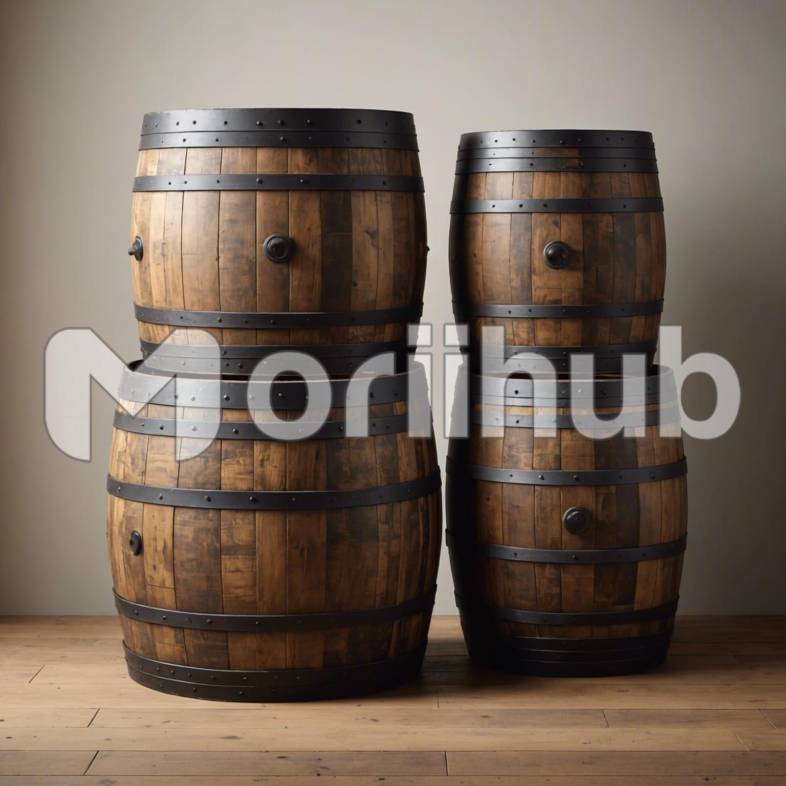 In a rustic setting, two sturdy barrels are stacked atop another pair of barrels, creating a practical yet visually intriguing display. The weathered wood of the barrels tells stories of time and use, with each barrel bearing its unique marks and imperfections. The top barrels balance securely, their rounded surfaces contrasting with the solid stability of the ones below. The arrangement, simple yet effective, evokes a sense of history and craftsmanship, highlighting the barrels’ enduring utility and the rustic charm they bring to their surroundings.
