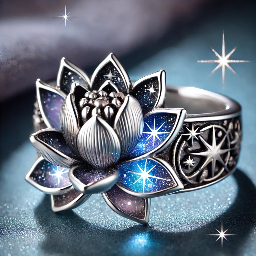 The “Starlight Lotus Ring” is an elegant silver ring showcasing a delicate lotus flower, with its petals intricately carved with glowing starlight patterns. The petals emit a soft, magical blue light, symbolizing serenity and spiritual growth. The band is decorated with stars and galaxies, enhancing the celestial theme.
