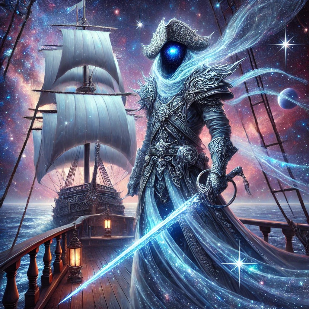 A mystical starlight pirate stands on the deck of an ethereal ship that sails through the starry expanse of space. The pirate is adorned in armor that shimmers with the light of distant stars, their cloak trailing behind them like a nebula. Their eyes twinkle with the brilliance of galaxies, reflecting the wonders of the cosmos.