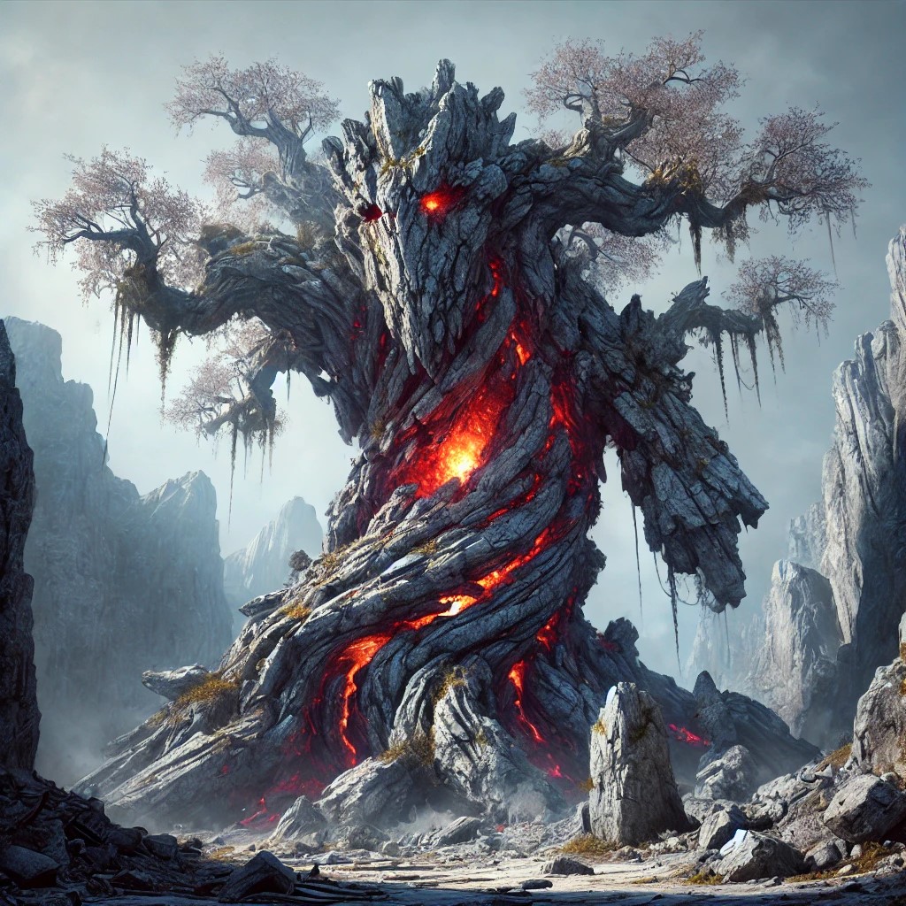 A stone ent—a massive, tree-like creature made of ancient stone and boulders. The scene will depict the stone ent standing tall in a rugged, mountainous landscape, with its body formed from craggy rocks and mineral veins. Moss and vines will cover its rocky surface, and cracks will reveal glowing, molten lava beneath. The stone ent’s limbs will be thick and powerful, resembling the trunks of ancient trees, and the ground beneath it will be cracked and weathered, showing the weight of its presence.