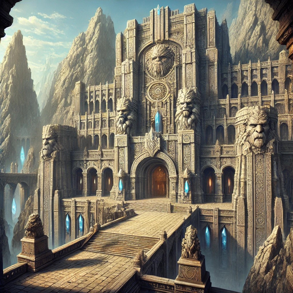 A Stone Magic School is nestled within a vast, ancient mountain range, its structure carved directly from the living rock. The school is a massive, fortress-like building with towering stone pillars and walls adorned with intricate carvings of ancient symbols and runes. The entire structure blends seamlessly with the mountains, with jagged cliffs and rocky outcrops forming natural defenses.