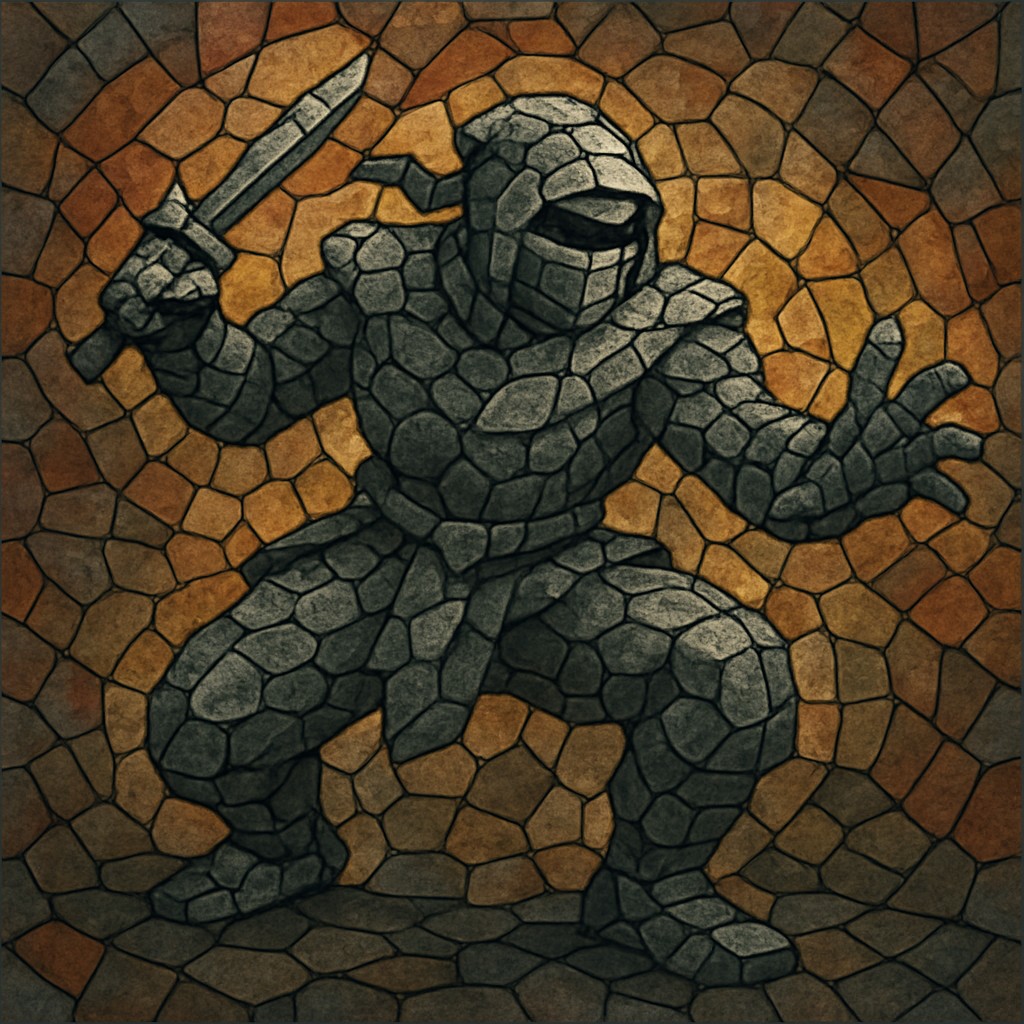This image features a digital abstract mosaic of a ninja composed entirely of stone-like tesserae, arranged to resemble a stylized stained-glass artwork. The ninja is shown in a dynamic, crouched pose, ready for action, with one arm extended forward and the other gripping a sword. The figure is built from interlocking stone-shaped pieces in varying shades of gray, slate, and earth tones, giving it the texture and impression of being sculpted from rock.