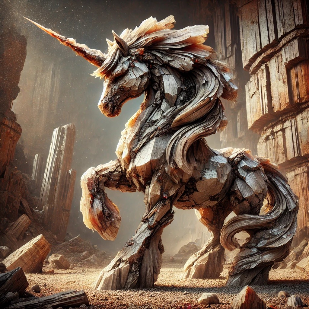 A majestic crystalline sculpture of a unicorn, carved from rough, jagged stone-like crystal with a smooth, polished horn. The unicorn’s body is solid and sturdy, shaped with angular facets that resemble the natural textures of stone and rock. The crystal shimmers with earthy tones of gray, brown, and deep ochre, representing the stone element. Its mane flows with stone-like textures, shimmering with embedded flecks of metallic minerals. The unicorn’s horn glows faintly, pulsing with a soft, warm light.
