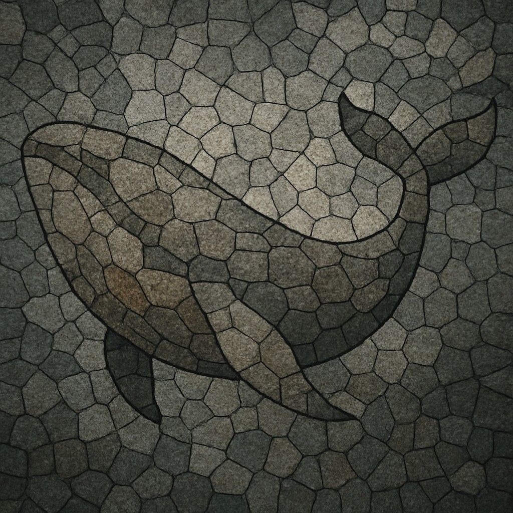 This image features a digital abstract mosaic shaped like a whale. The whale is composed of stone-textured tesserae in earthy shades of gray, brown, and beige, creating a natural, elemental look. Each stone piece is irregular, outlined by dark grout lines that emphasize the form and flow of the whale’s body.