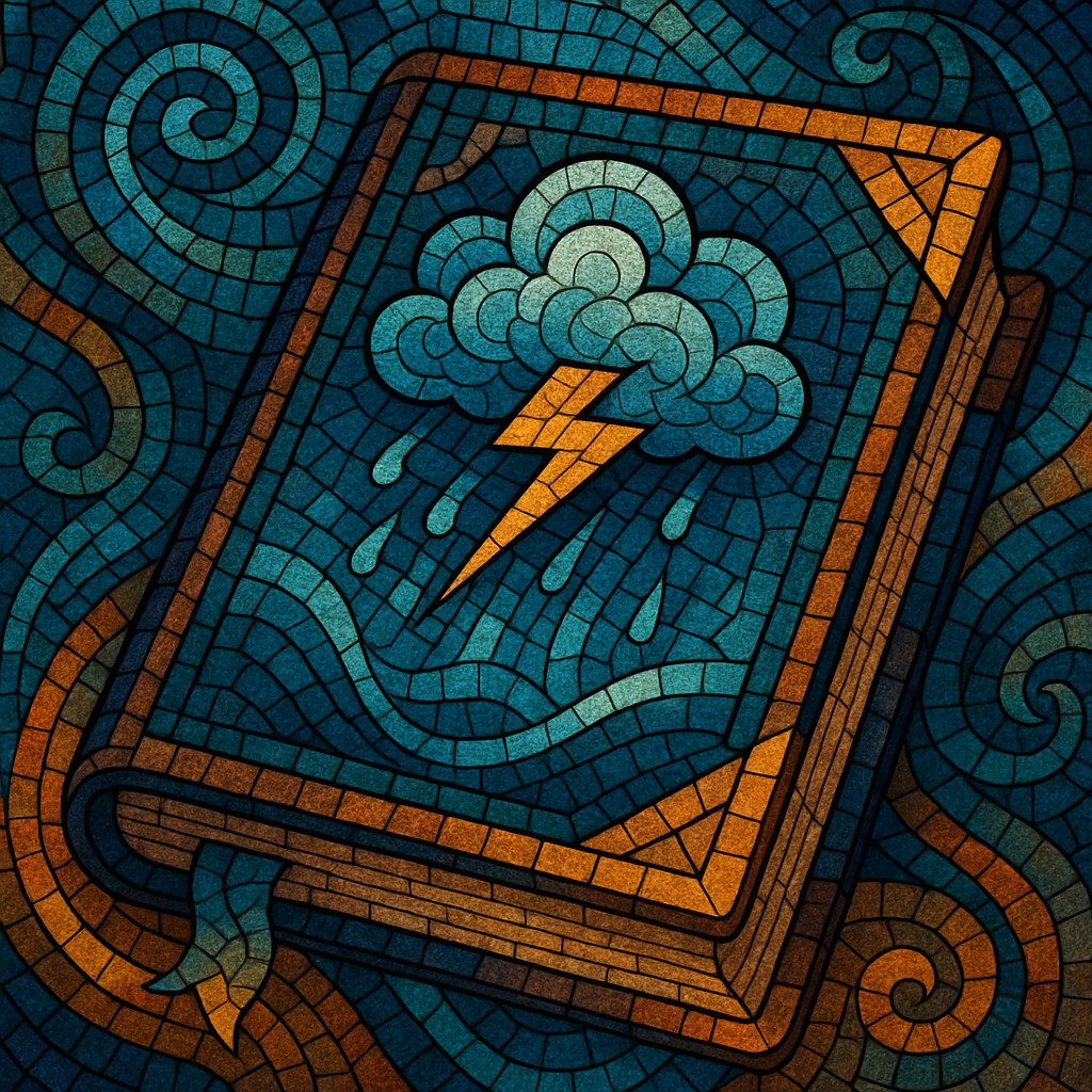 This image presents a digital abstract mosaic in the shape of a grimoire, symbolizing the element of storm. Rendered in a stained-glass style, the composition is rich with swirling patterns of deep blues and vibrant golds. At the center of the grimoire’s cover, a storm cloud unleashes rain and a bold lightning bolt, surrounded by waves and wind currents depicted through fluid, interlocking tiles.