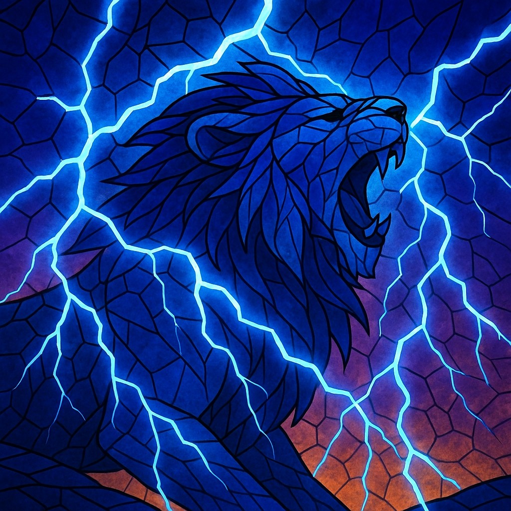 This powerful digital abstract mosaic depicts a roaring lion infused with the storm element, rendered in a stained-glass style. Composed of deep cobalt, indigo, and navy shards outlined in bold black, the lion’s majestic mane flows wildly as it unleashes a thunderous roar. Bright, jagged lightning bolts in electric blue crackle across the image, illuminating the scene with raw, elemental energy.