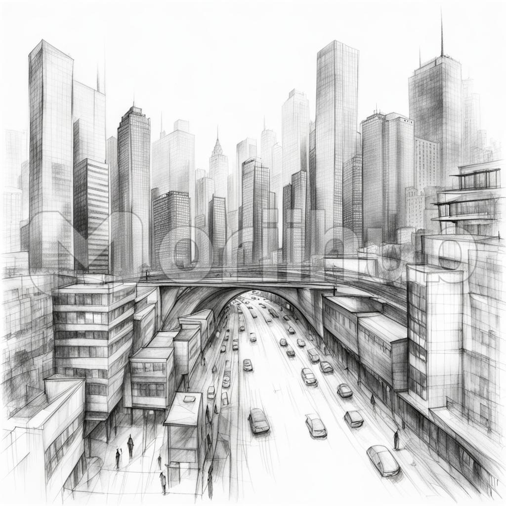In a detailed pencil sketch, a bustling cityscape comes to life, complete with vehicles navigating the busy streets below. Each building stands tall with architectural finesse, while cars and buses move with purpose along the winding roads. The sketch captures the dynamic energy of urban life, with every stroke portraying the movement and vibrancy of the scene. It’s a snapshot of city living, where the rhythm of traffic and architecture harmonize in pencil perfection.