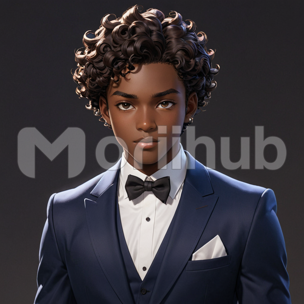 A dapper young gentleman commands attention in his impeccably tailored tuxedo, his curly hair adding a touch of charm to his ensemble. With confidence in every step, he exudes an air of sophistication and refinement. The sleek lines of his attire complement his stature, accentuating his poise and charisma. He stands as a symbol of style and grace, captivating all with his effortless allure.